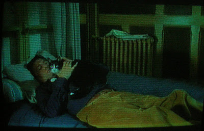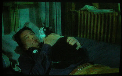 "The moods (of Histoire de Marie et Julien) range from troubling and disturbing to lighthearted, especially in Julien’s interaction with his cat, Nevermore. Originally the cat was to have a speaking part. Some have reproached the film for the scenes in which the cat obviously makes some “mistakes” such as watching the boom microphone or scrambling back from the approaching camera." (from Jonathan T.'s wonderfully lively Paris Journal on Film Journey )