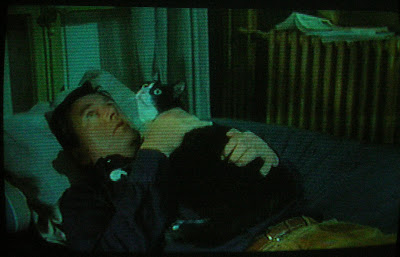 Alas, 30 years on, Rivette gets reproached when in Histoire de Marie et Julien (2004) he crystalizes some of his former narrative terror and anti-illusionism into one brief shot of a cat on a man's chest recoiling from the camera and the boom, the whole appartus bearing down on them in a tracking shot. A Bazinian anti-illusionism. Once the camera settles, the cat stares up at the boom mic. Perhaps the man (Jerzy Radziwilowicz) is "covering" for the cat when he looks up too and says "nosing around upstairs again? Don't lie, I can see it in your whiskers." This being a film by Rivette the line is sinister (what fiction/terror hovers overhead of our forward stare?), the scene tells a terrible truth on at least two levels, and Rivette once again revives the stakes of the tracking shot to a life or death situation.
