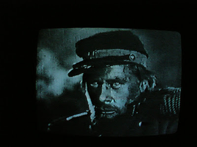 The above still frame could be right out of one of the more Fordian scenes in COLOSSAL, where Ventura, his daughter and another man stand outside their home, nearly in salute, to watch a funeral procession off screen (THE SUN SHINES BRIGHT). But what is this image's context in GRAPES? It's the last shot of Muley's flashback recollection of the destruction of his home by the Shawnee Land & Cattle Company.