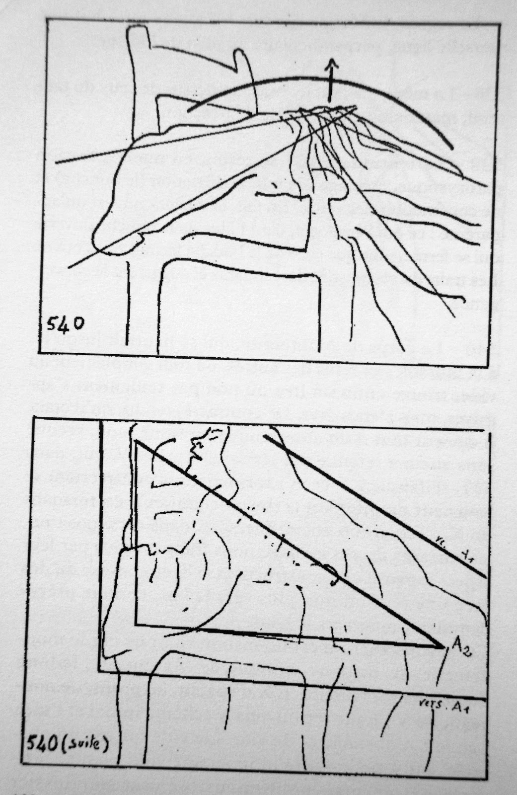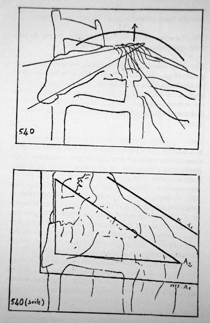 540 - The body of Marguerite - which has thus far faced the wall - refused by others, or simply a vacuum, finally finds a place not only to lean, but to fit. Contracted, tense, she suddenly becomes supple, almost limp, sobbing uncontrollably. The Vs which, in 537, faced each other and expressed a contraction, now face her back and, forming an X, signify a liberating expansion. Because, in this position, the character's outbursts strike us more by their expansive, constructive aspect and the convex line of the back creates a tension no longer downwards, as before, but upwards.