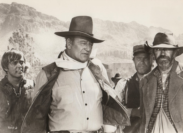 2) Put in the same circumstances as Gary Cooper, John Wayne doesn't ask for anyone's help. He has a job to do: he is sheriff; he is paid for that. He locks himself in his office, gets his guns ready and, with the help of a sixty-year-old man who acts as his assistant, awaits with determination the killer's brother, who promised to break into said office.